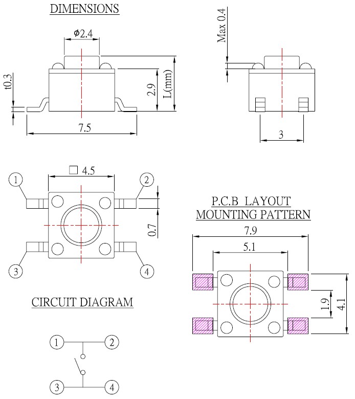 TK045 Series Long Life Tact Switches • 4.5mm x 4.5mm tactile switch • 100 ± 50; 160 ± 50; 250 ± 50 gram force options • Vertical and right angle thru hole designs • Silver plated contacts 系列名 TK-045 性能参数 1.Rating......................DC12V 50mA