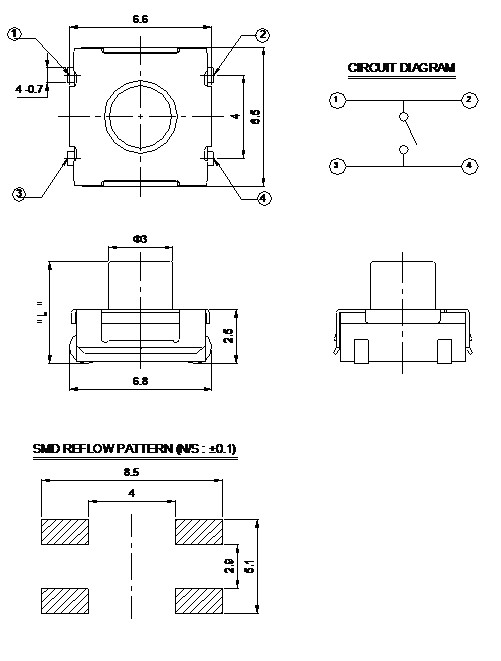 TK-1062 Series SMT Tactile Switches • 8.8mm x 8.5mm tactile switch • 160; 250 gram force options • Surface mount design • Silver or gold plated contacts 系列名 TK-1062 性能参数 ◆CONTACT RATING: 50mA 12VDC