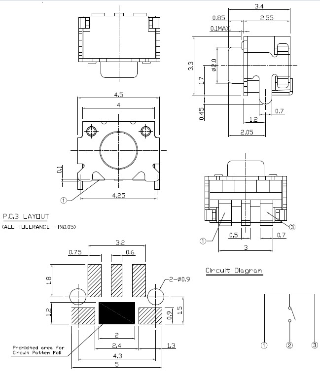 TK-043 Series Tact Switches • 4.5*3.65 tactile switch • 180±50 gram force options • Vertical and right angle designs • Silver or gold plated contacts 系列名 TK-043 性能参数 用途 规格