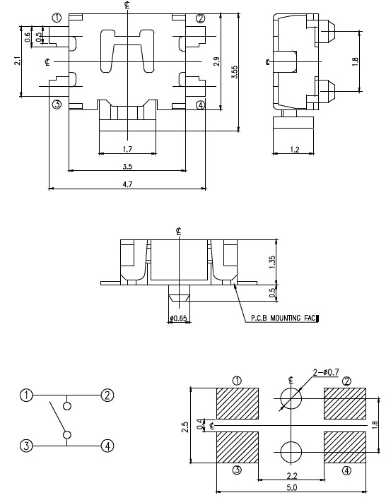 TK-034CASeries SMT Right Angle Tactile Switch 3.5*2.9 tactile switch .180±50 gram force options . Right angle surface mount design .Silver plated contacts 系列名 TK-034CA 性能参数 用途 规格