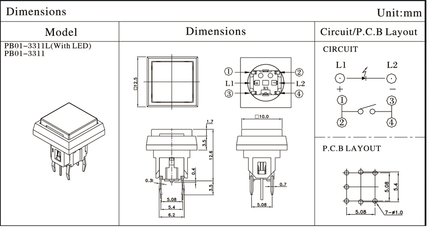 12VDC 50mA12.5mm*12.5mm100,000cycles160±50gf/250±50gf0.25±0.1mm