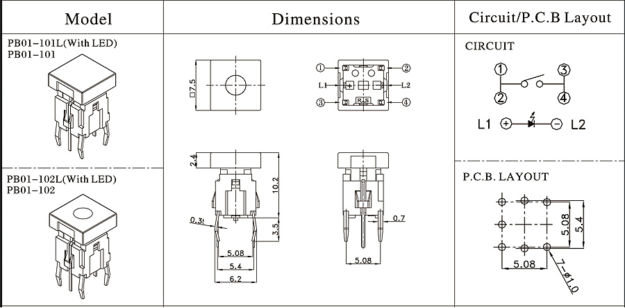 12VDC 50mA7.5mm100,000cycles160±50gf/250±50gf0.25±0.1mm