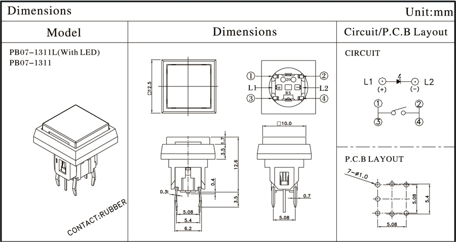 12V DC  50mA12.5mm*12.5mm100,000cycles≥200g≥1.0mm