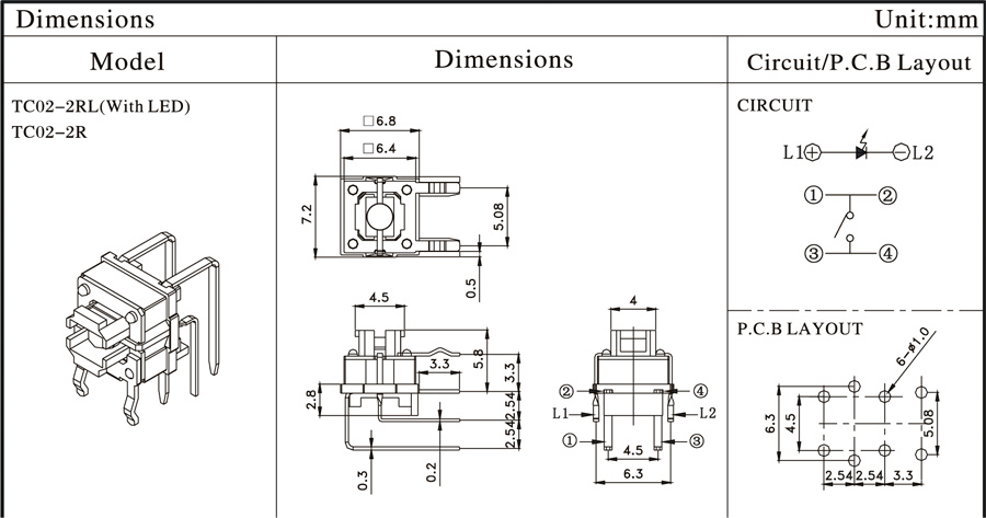 12VDC 50mA7.2mm*6.4mm100,000/50,000cycles160±50gf/250±80gf0.25±0.1mm