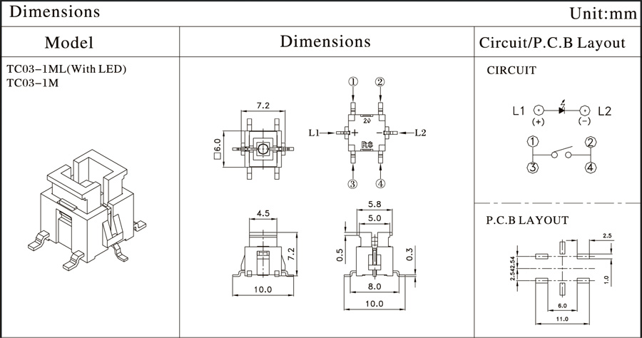 12V DC  50mA7.2mm*6.0mm100,000cycles160±50gf0.25±0.1mm