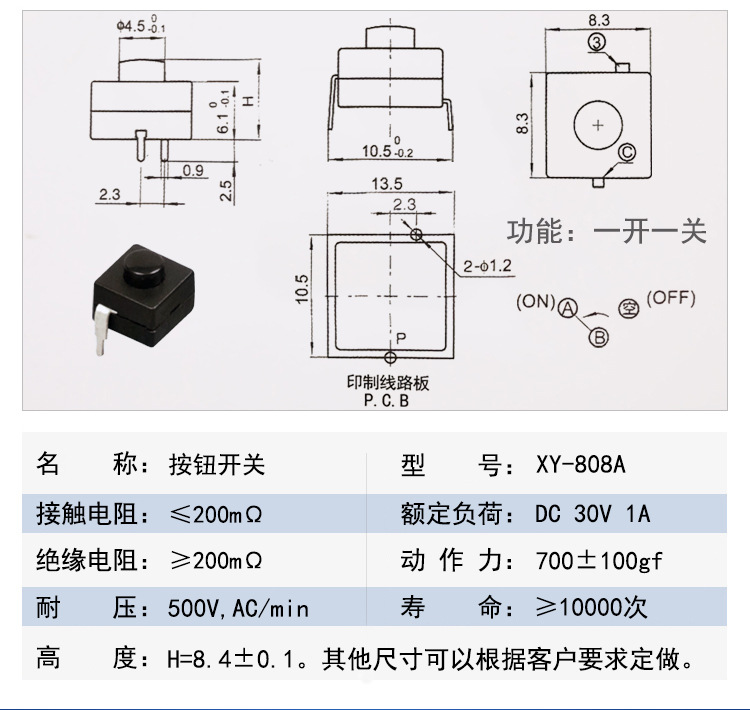 型号XY-808A产品类型按钮开关按钮头直径φ4.5±0.1