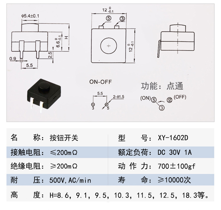 型号XY-1602D产品类型按钮开关按钮头直径φ5.4±0.1