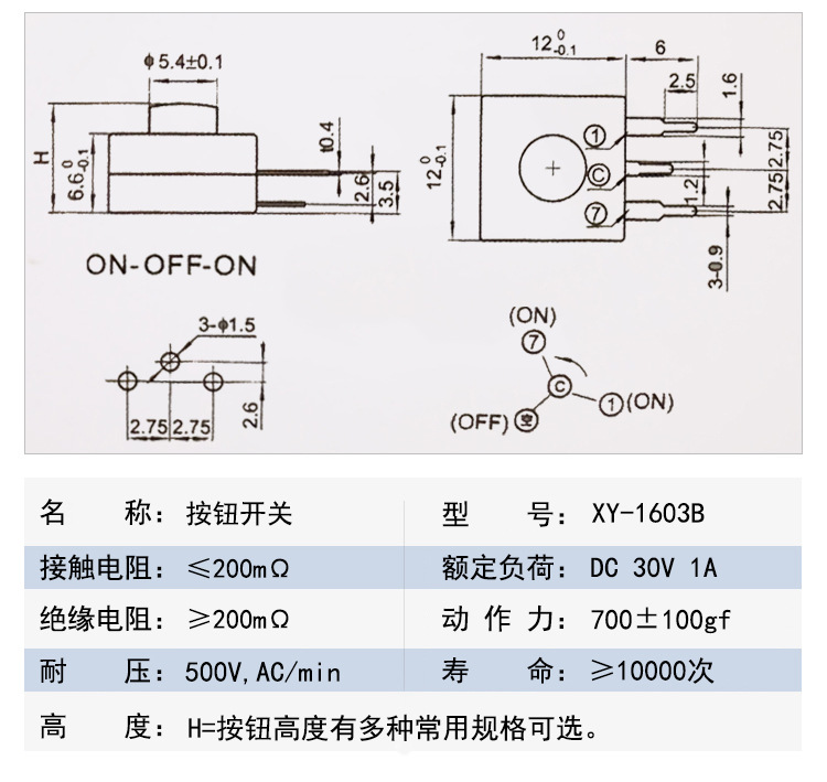 型号XY-1603B产品类型按钮开关按钮头直径φ5.4±0.1
